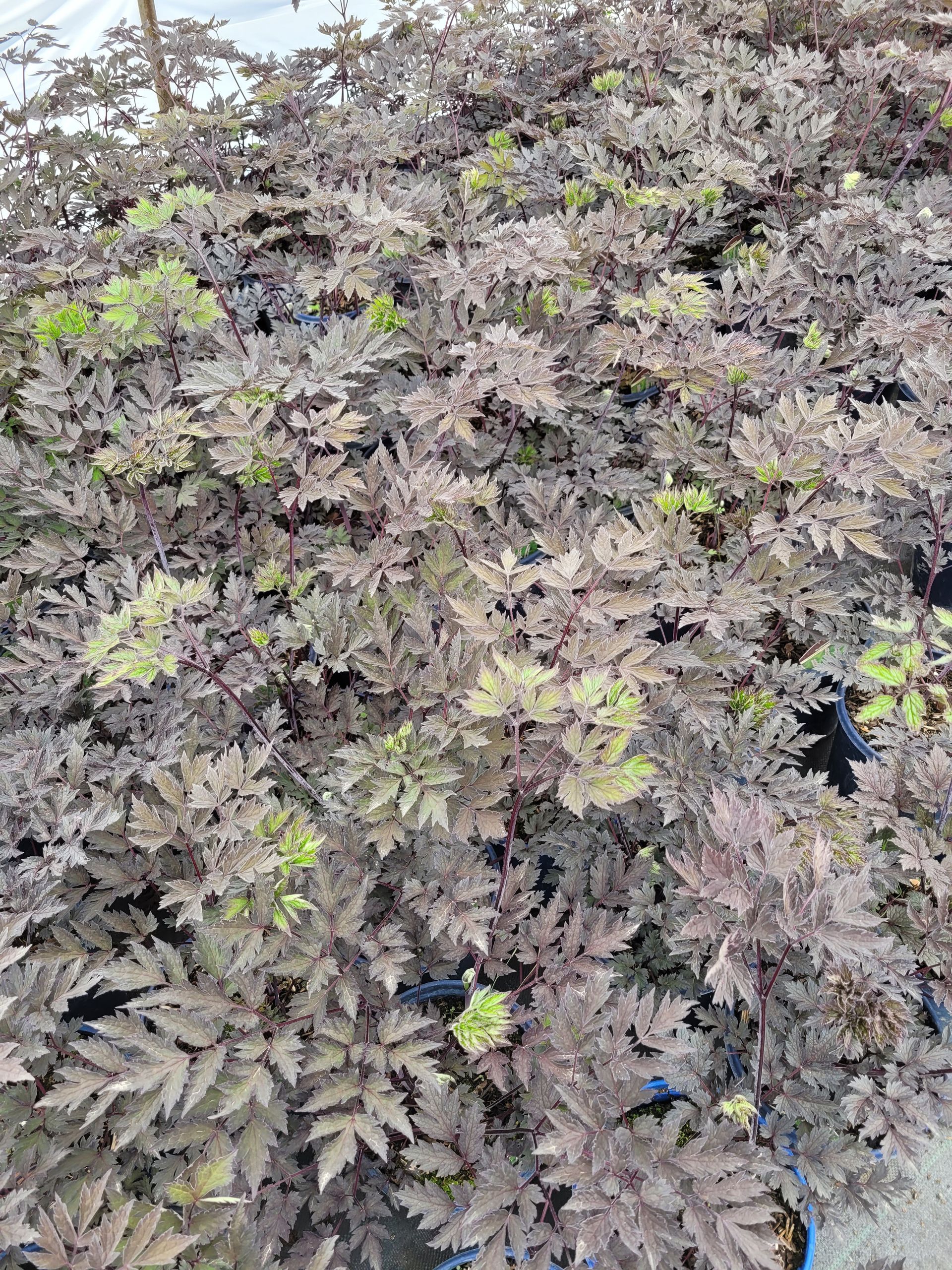 New growth tends to be green but quickly deepens to dark purple-black. The white bottlebrush flowers contrast nicely. A great shade garden specimen.