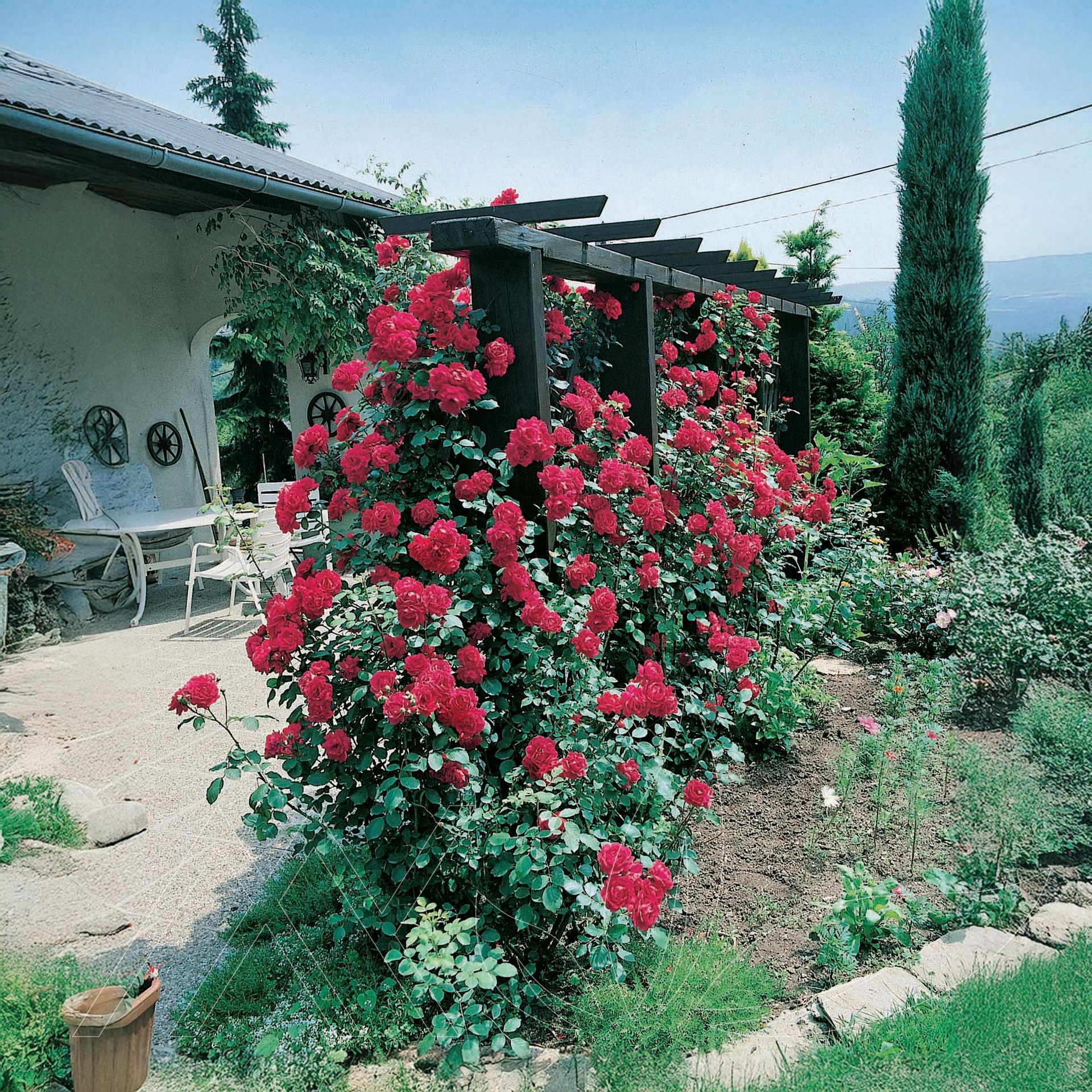 Recurrent. This rose has large red, semi-double flowers. Remove faded flowers for continuous blooms throughout the season.