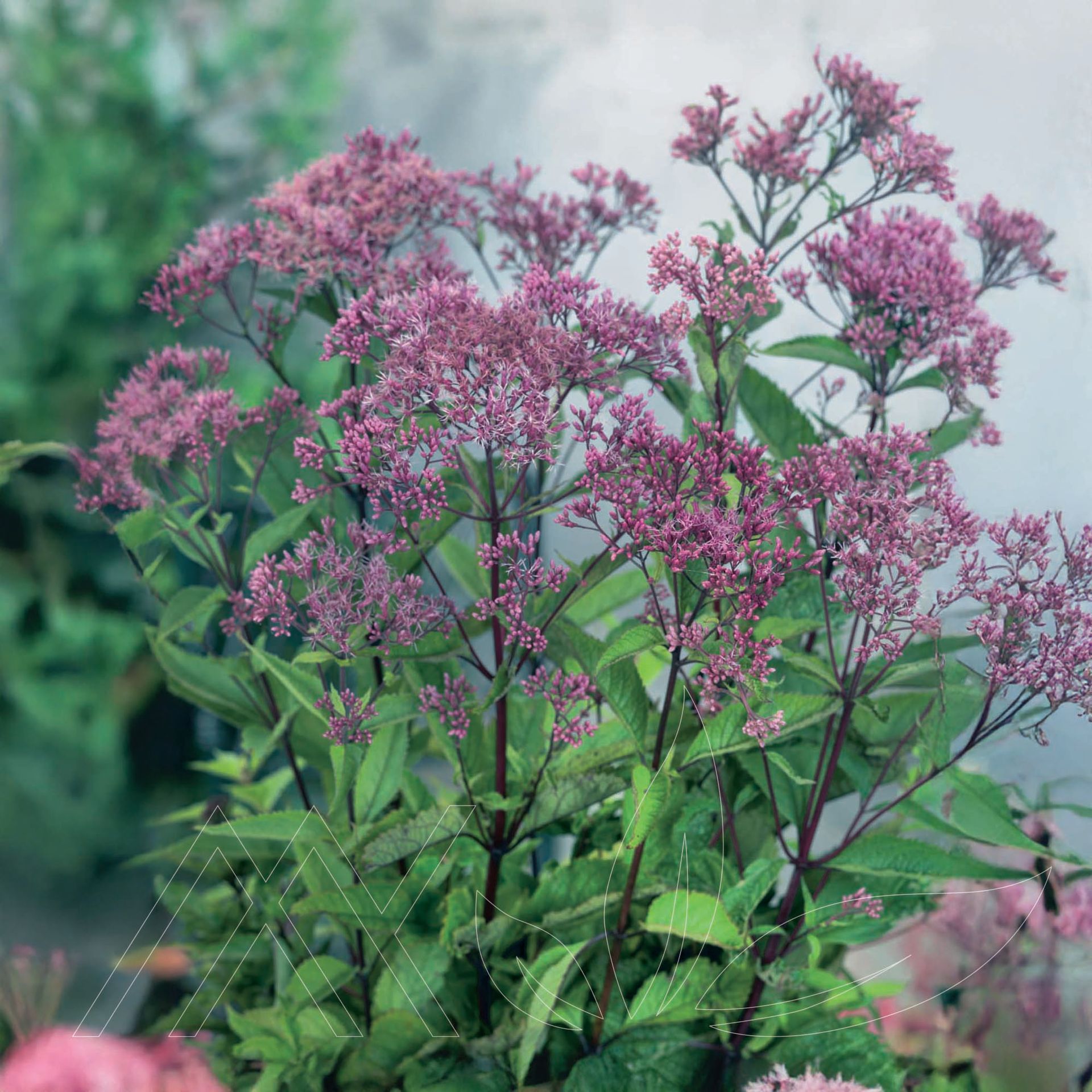 The reddish pink blooms are held on deep burgundy stems with dark green leaves.